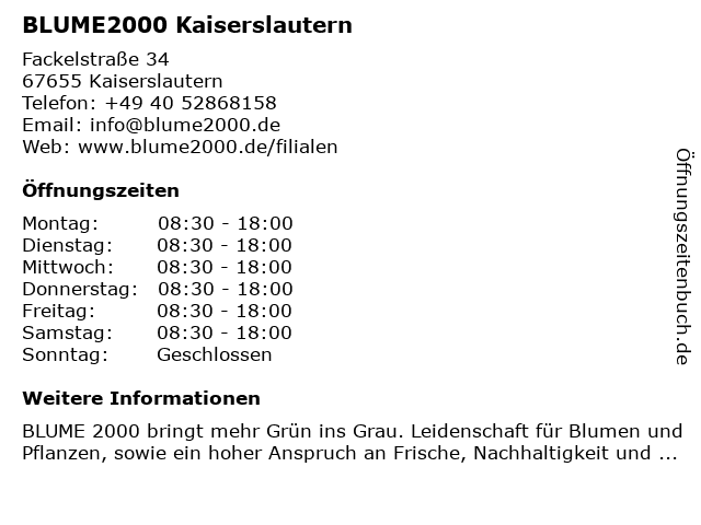 Blume 2000 filiale fackelstraße 34 in kaiserslautern. Blume 2000 in der fackelstraße 34 in kaiserslautern hat am montag 11 stunden geöffnet.